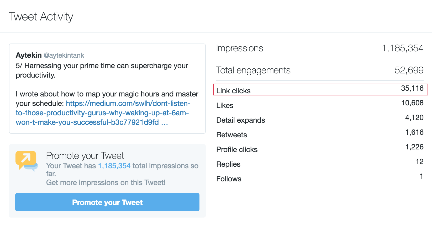 This tweet received more than 1.1 million impressions and over 35,000 clicks, helping to drive traffic back to the original post on Medium.