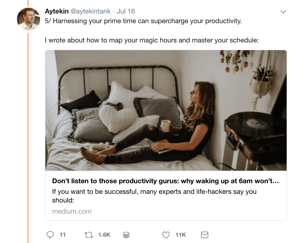 He chose to create a Twitter thread based on his post entitled: ‘Don’t listen to those productivity gurus: why waking up at 6am won’t make you successful’.