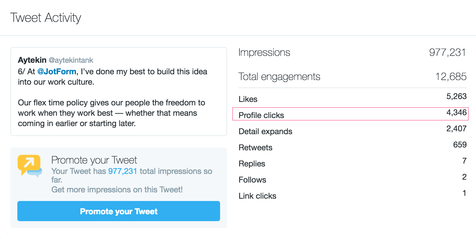 The sixth tweet in the thread mentioned @JotForm and 4,346 people clicked from this tweet to JotForm’s profile to learn more about the business: