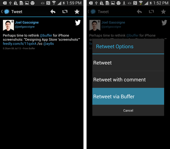 And here is the Android view of scheduling retweets with Buffer. Inside Echofon’s Android app, you can of course also just long press on a Tweet and then retweet with Buffer right from there:
