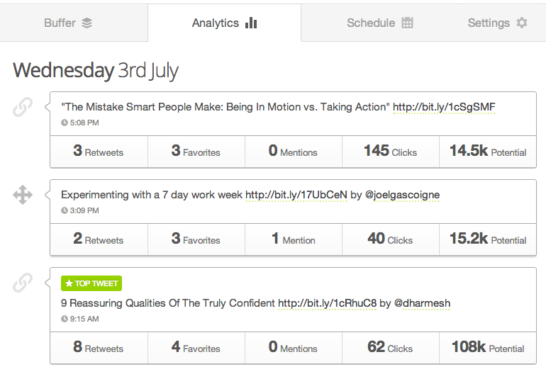 Every update that you share through Buffer from Echofon and anywhere else will automatically be tracked for you. Buffer’s analytics tab will tell you how many clicks, retweets, favorites and more you’ve received on your posts. Here is a quick snapshot of my recent postings: