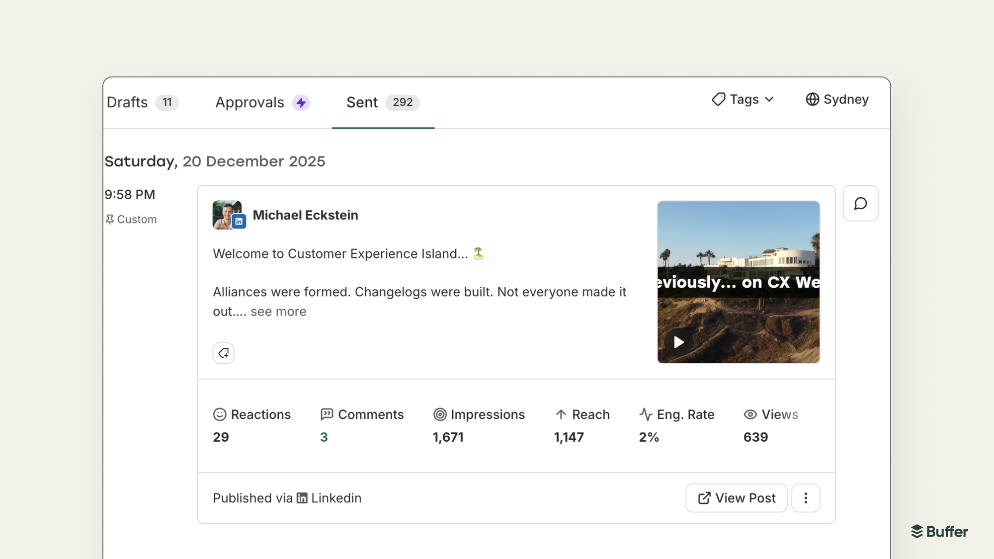 We partnered with LinkedIn to expand Personal Profile Analytics. You now get views, watch time, and engagement rate alongside the standard metrics, all inside Buffer's Sent Posts tab.