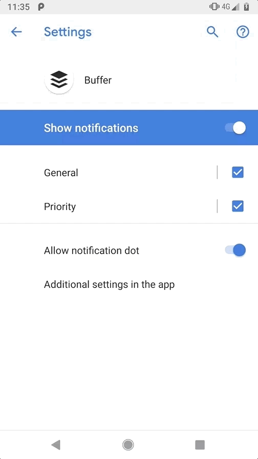 </activity>Now, the “Additional settings in the app” option will display on our application notification settings and when clicked, the PushSettingsActivity defined above will be launched.