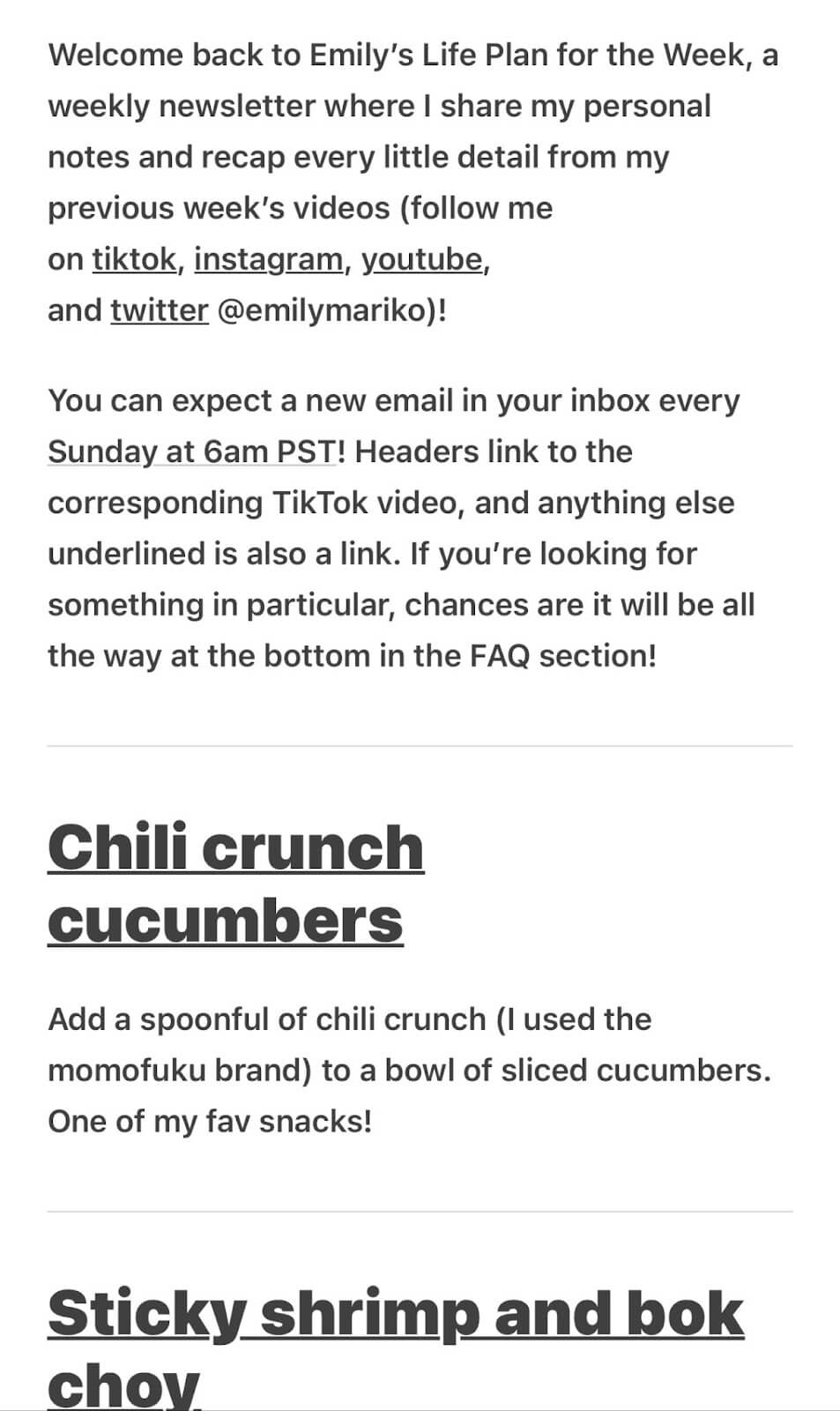 By the way, this doesn’t mean your newsletter has to look fancy – a more minimalist look can work great as well. Content creator Emily Mariko has a super simple layout for her newsletter. The reason it works so well is that all of the information is laid out clearly.