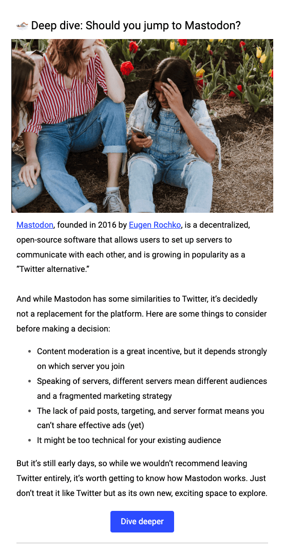 We’ve found at Buffer that whenever we cover timely topics – like this Mastodon article we published after Elon Musk took over Twitter – we get more traffic than usual on our blog. The same can happen for your newsletter if you’re discussing trending topics.
