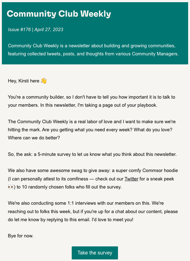 Here's an example from The Community Club Weekly that Buffer Content Writer Kirsti Lang set up during her time there. Let's be honest, no one loves filling out a survey — so she incentivized subscribers to fill it out with the promise of a swag giveaway.