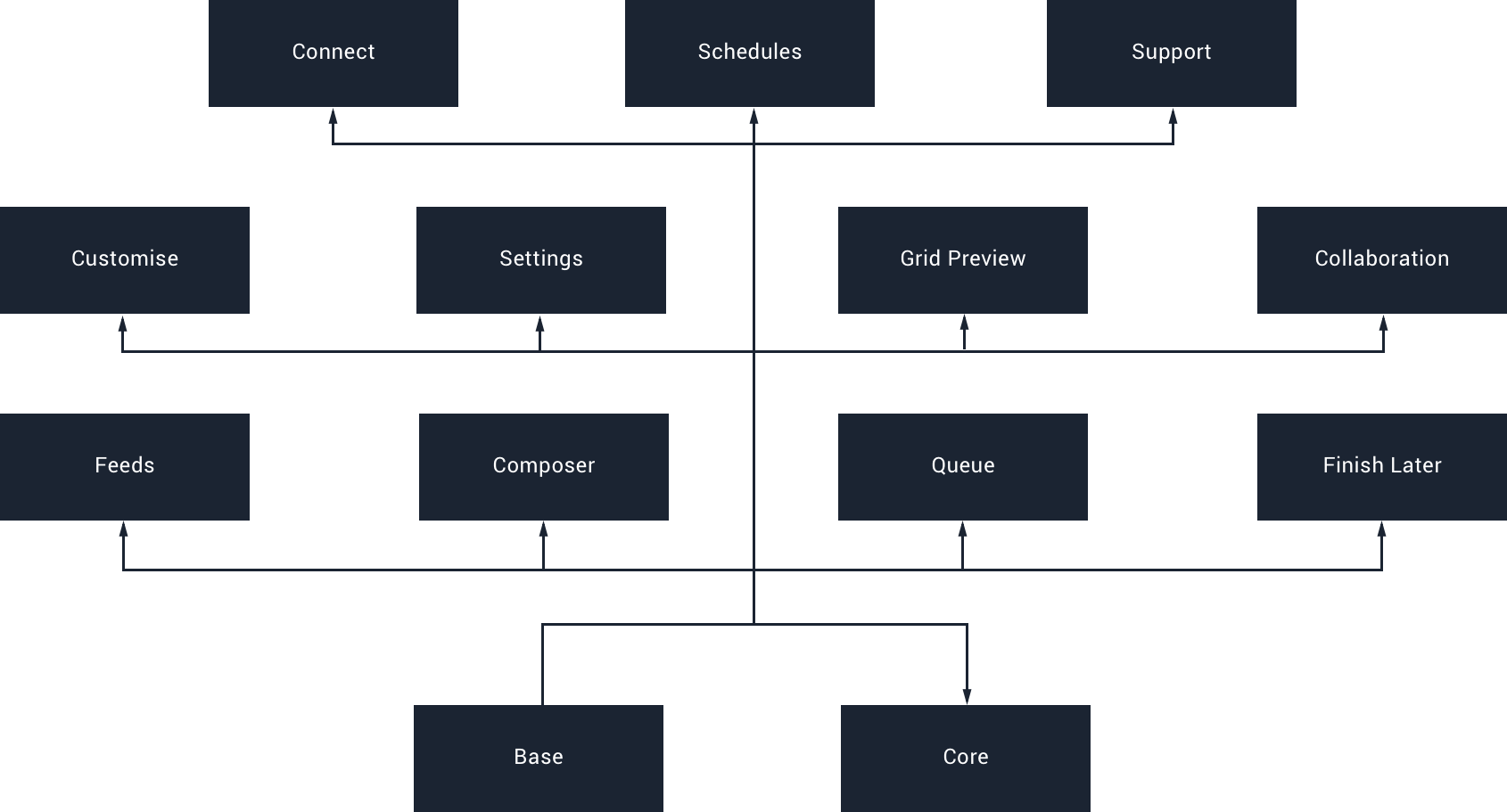 Before you start, it’s probably good to try and think of a vision for your feature modularisation. Yes you could just crack on and start moving things around, but without thinking about things first you may end up making mistakes and / or creating more work for yourself in the long run! Whilst for larger applications you will likely be start within a single module, thinking about this bigger picture will help clarify the “what ifs” and “hows” that you will likely encounter. For example, in the case of Buffer Publish our android app could eventually be split into these different feature modules: