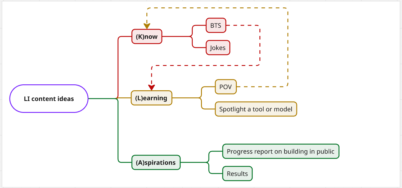 - Framework (KLA): I rotate between posts on what I know, what I'm learning, and my aspirations.