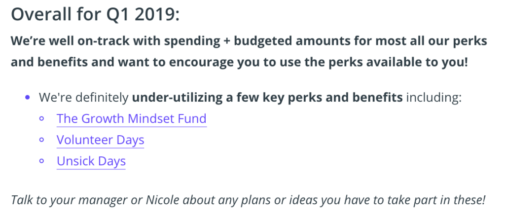 To prevent folks from forgetting this perk, our quarterly review is also shared with the entire company.