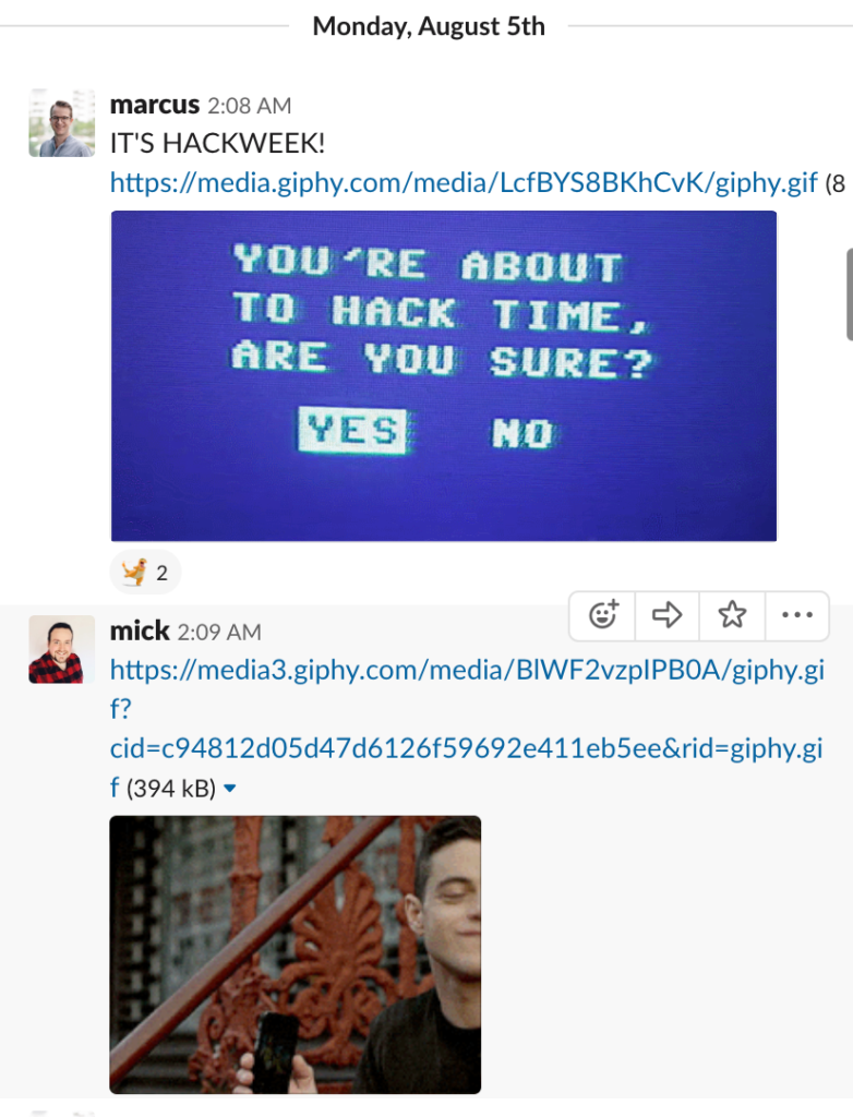 - Create a Slack Channel: Ours is called #hack-week and we use it only that week. We encourage everyone taking part in the event to join it, and it’s a good spot to share excitement leading up the event. A couple of funny GIFs always help to set the right mood.