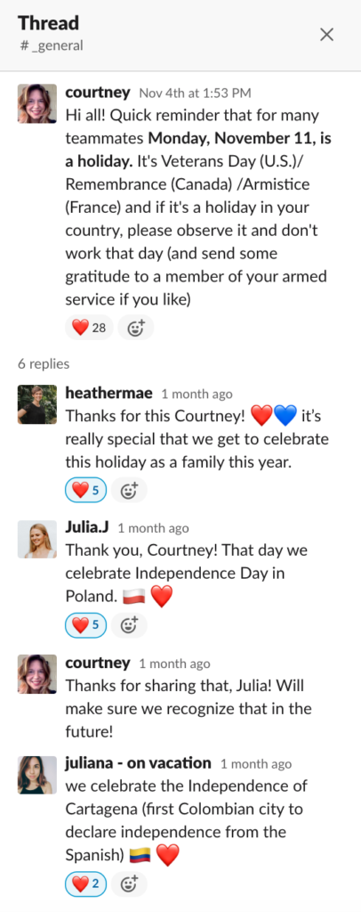 On a global team, we all celebrate different holidays – which is great! But it’s important to make it easy for teammates to be fully off for the holidays of their region without putting the burden on them to ask for the time or have to justify it.