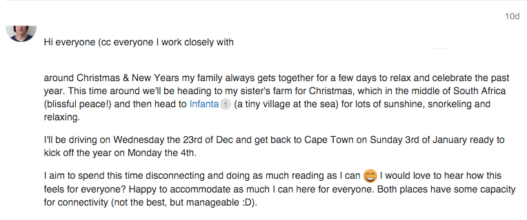 With this small but significant change, folks now take the holidays of their region automatically. No need to message anyone, no need to share why the holiday is important or what you’re going to do.