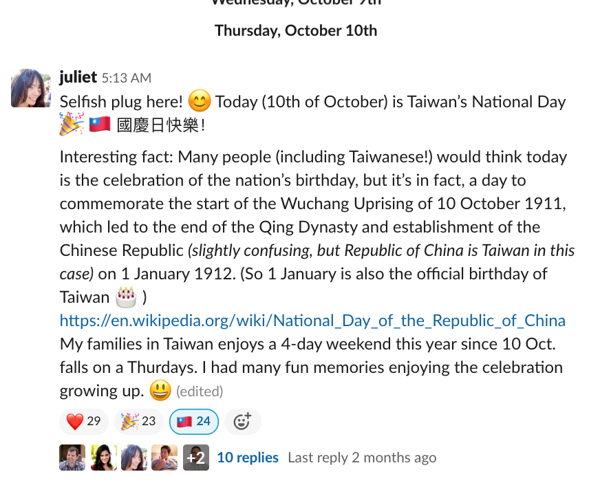 Here’s Juliet sharing a reflection on Taiwan’s National Day: