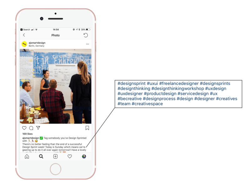Hashtags are important for AJ&Smart to reach its target audience on Instagram. “A huge thing for us is designers following us,” Jonathan explained. “Designers follow us and then when their boss is looking to hire an agency, they recommend AJ&Smart. It’s made sales so much easier for us.”