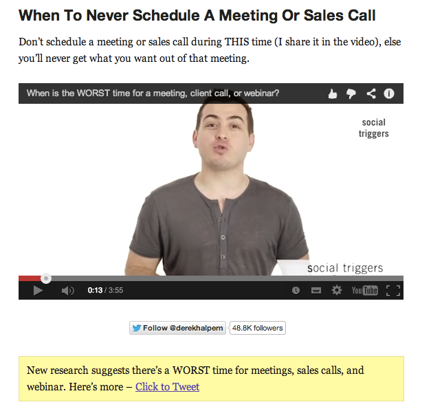 In this video post from Derek Halpern of Social Triggers, he makes a case for the worst time to schedule a meeting or webinar (hint: it’s probably not what you think).