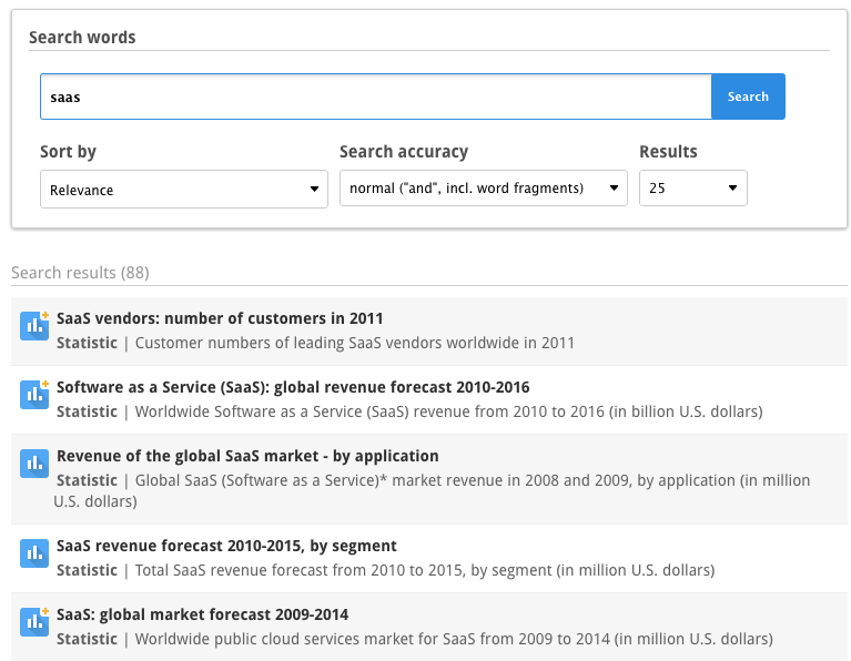 Where to find studies and statistics: Statista.com is like a Google for studies. Type in anything (e.g., “SaaS”) and get research that mentions your search terms (note: some of it is behind a well-worth-it paywall)