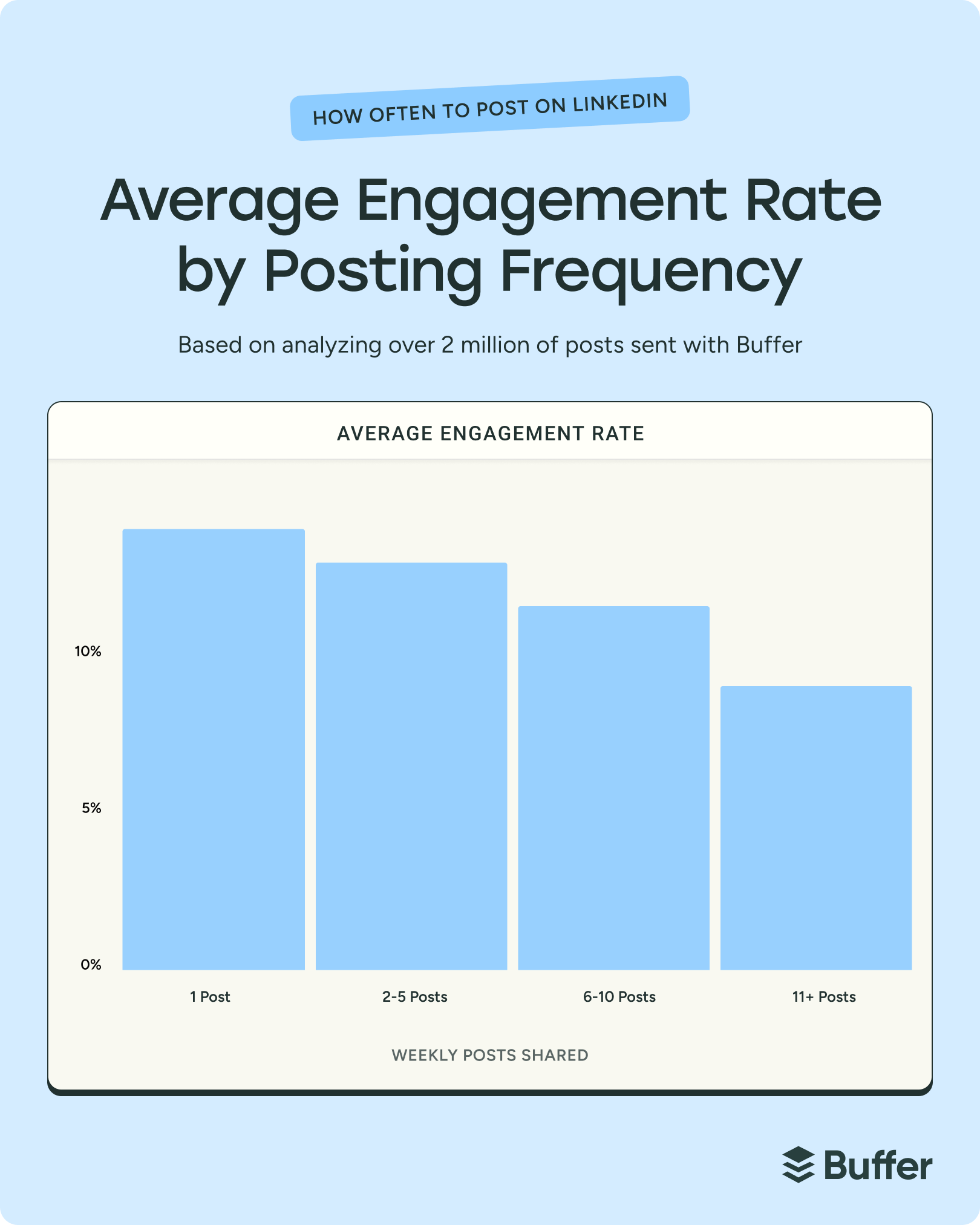 Our data shows that posting 2 to 5 times weekly on LinkedIn is the sweet spot for improving reach and engagement without overwhelming your schedule.