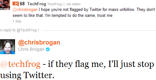 Chris said that because he had become known as a followbacker (he used to recommend doing it) the people he followed were spamming him relentlessly. He said either he would have to be allowed to unfollow everyone, or he would quit Twitter. (He unfollowed everyone.)