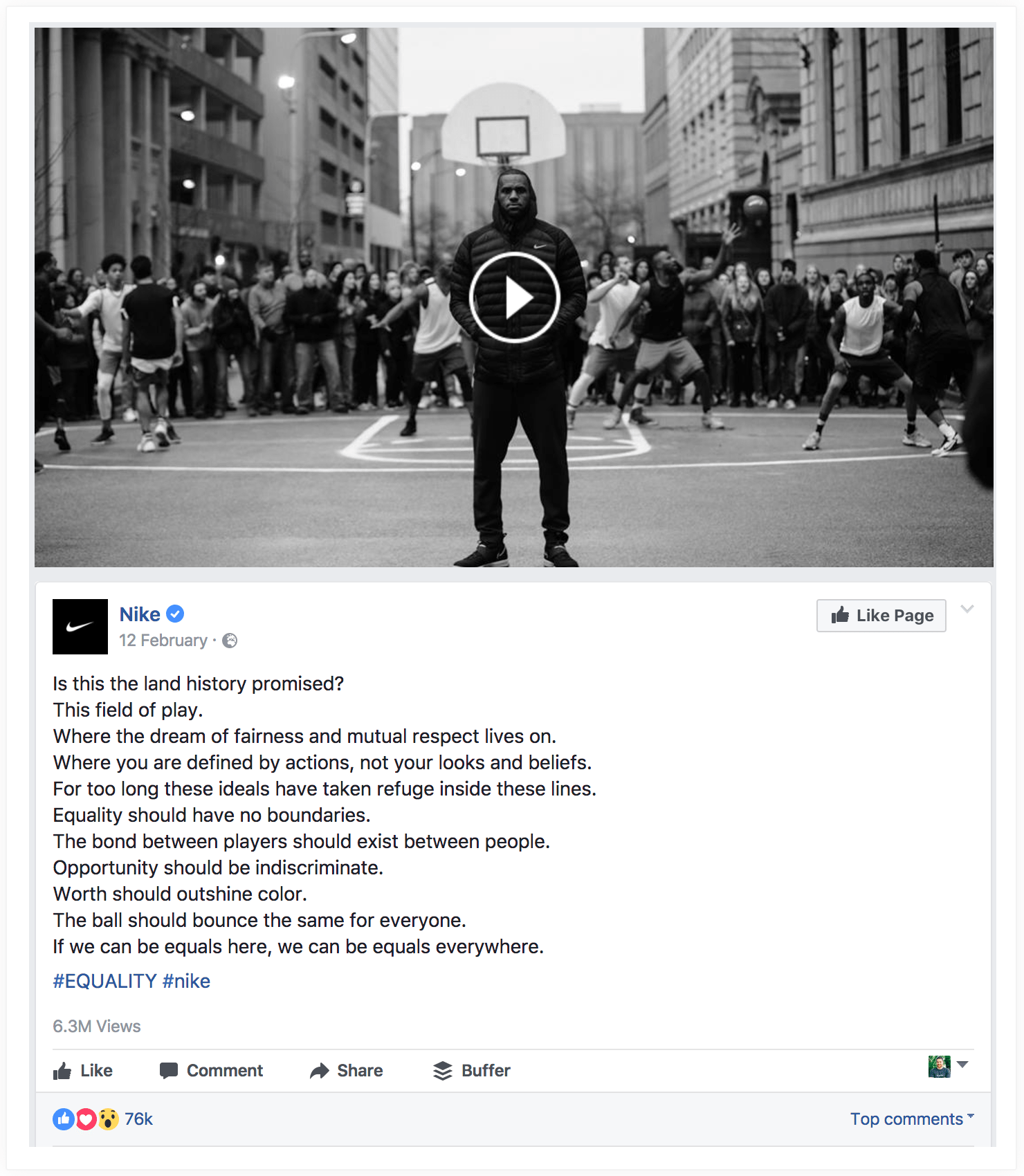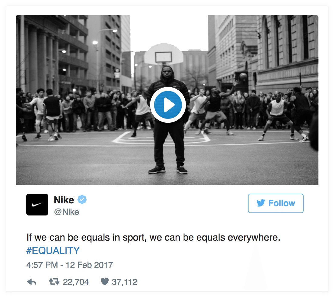On Twitter, Nike has reduced the message to fit within Twitter’s 140 character limit and kept things simple by using the last line of the verse and embedding the accompanying video natively: