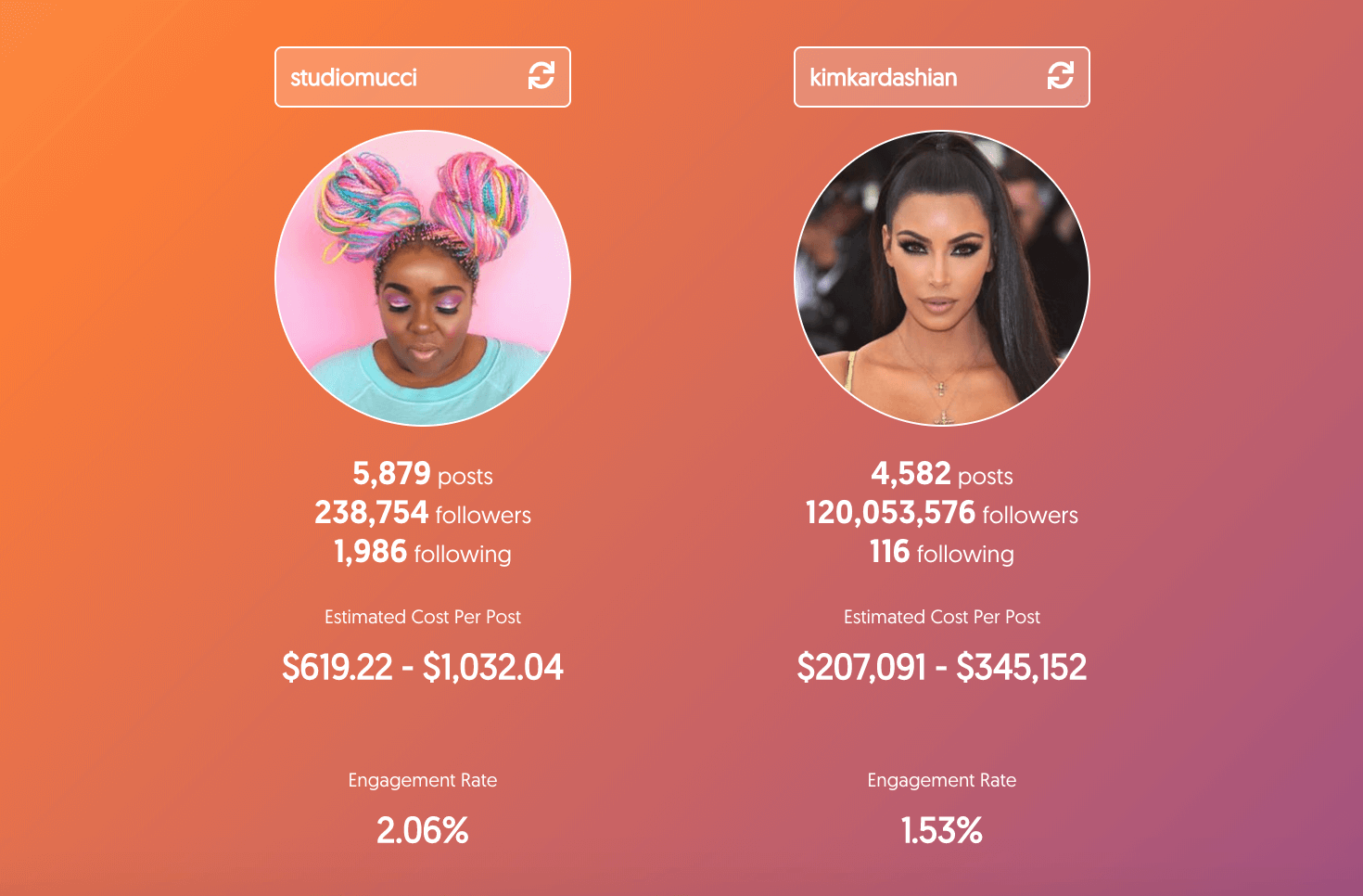 While there’s no industry standard for what to pay influencers, Influencer Marketing Hub has a great tool that allows you to estimate post costs, engagement rate and ROI. The calculator is a great jumping point for negotiations and pay estimates, but shouldn’t be your “end-all, be-all” of influencer pay. At the end of the day, the best influencer for your brand is one your brand can also afford.