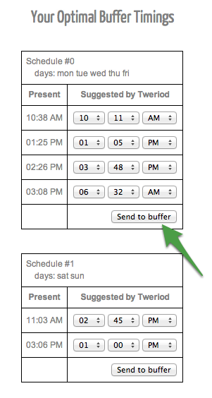 A lot of people have already told us this: “You know, I first go and get my Tweriod report, then I take those times and set them up inside Buffer.”