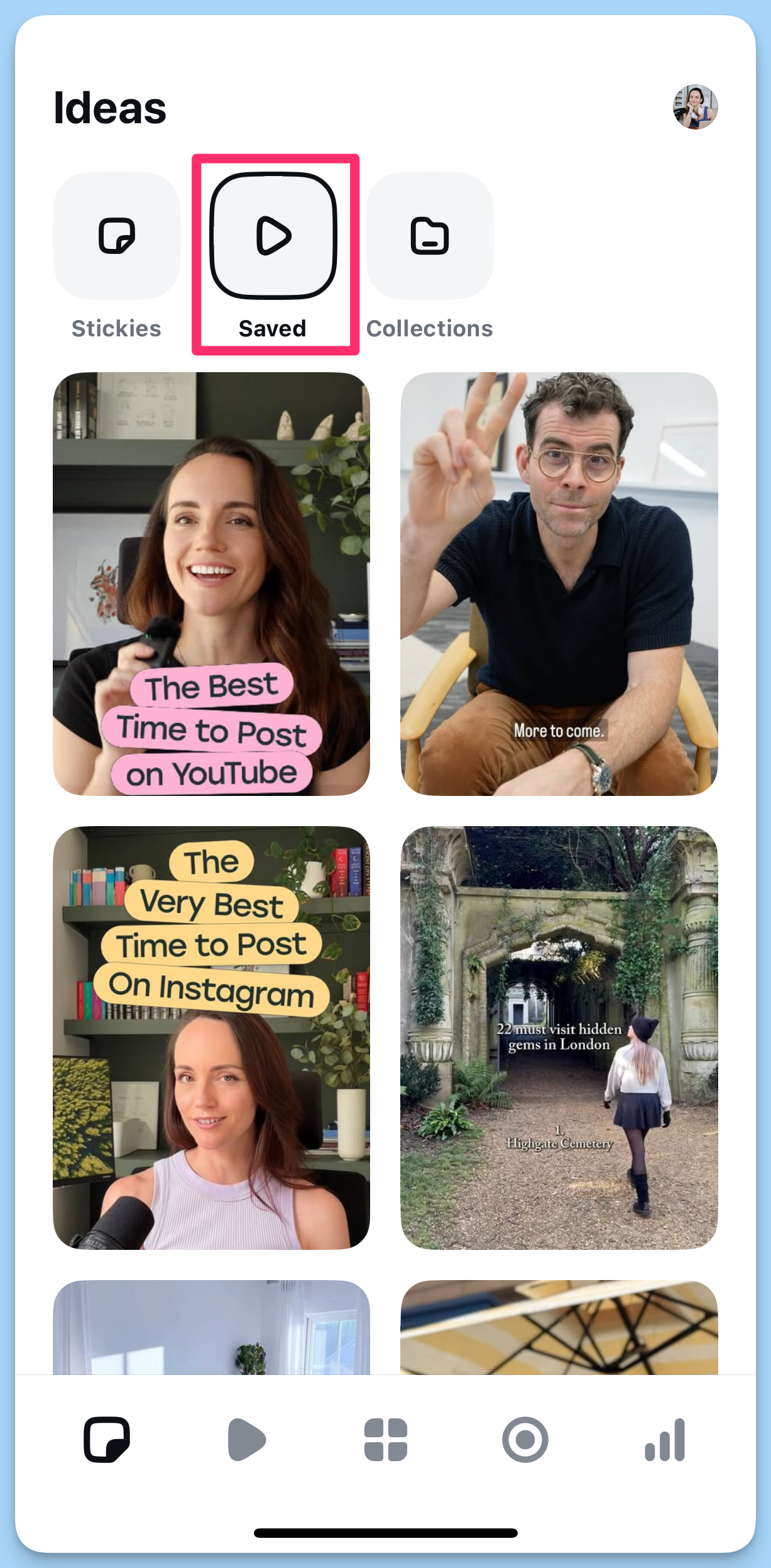 Here, you’ll also find all your saved reels from Instagram by tapping the ‘Saved’ button at the top, as well as your Instagram collections.