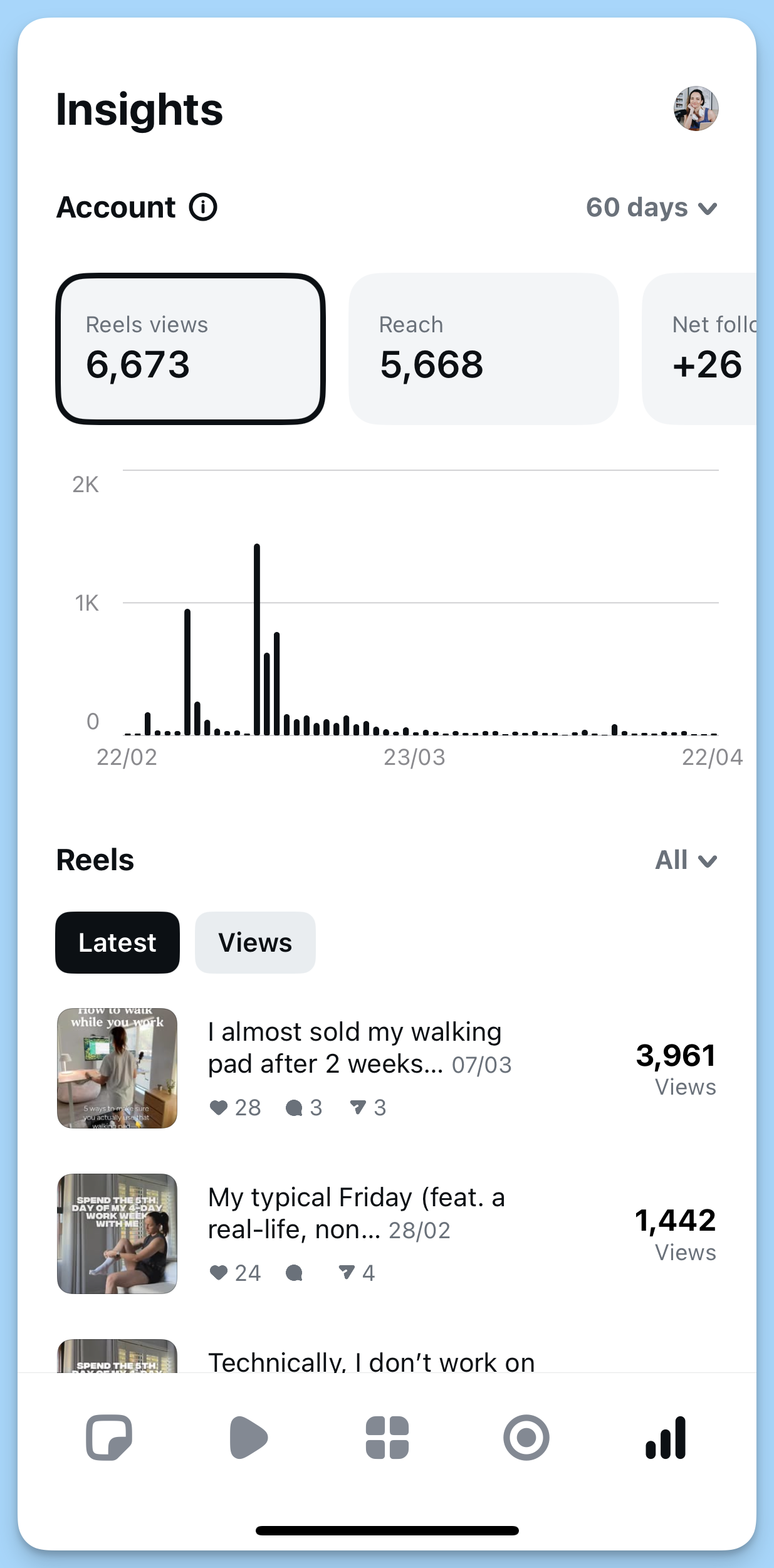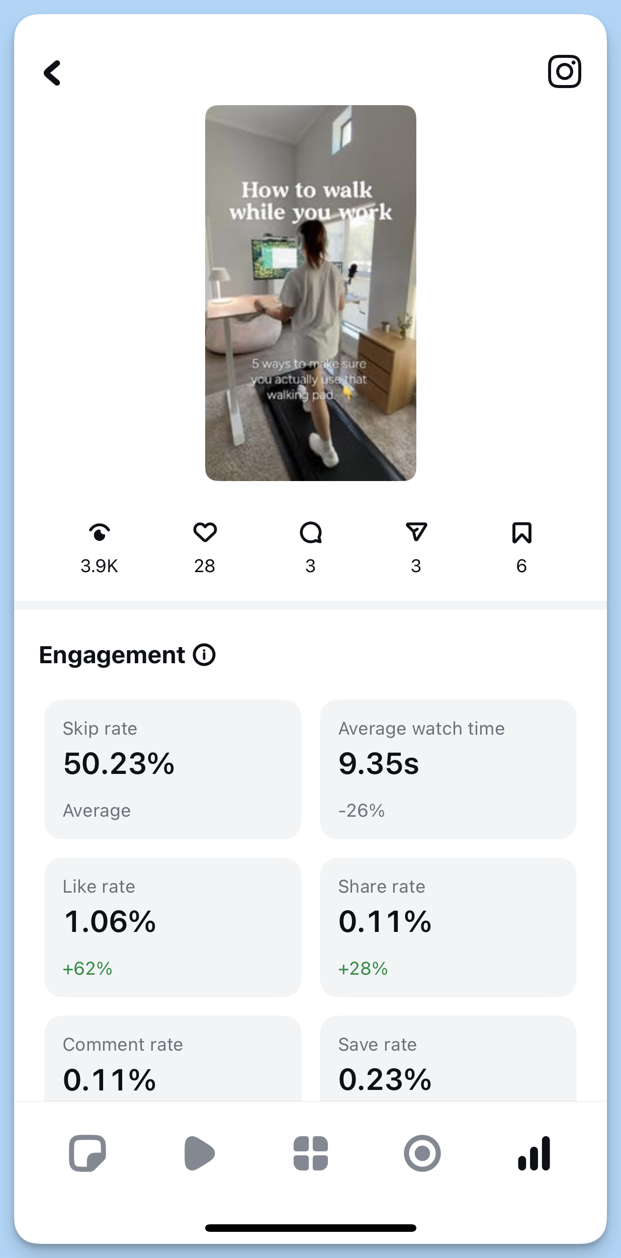 Tapping the graph icon on the bottom right of Edits will open real-time Insights for all your reels for the last 7-60 days. Tapping on one will open up in-depth metrics, including some interesting ones exclusive to the Edits experience (like skip rate, like rate, and share rate).