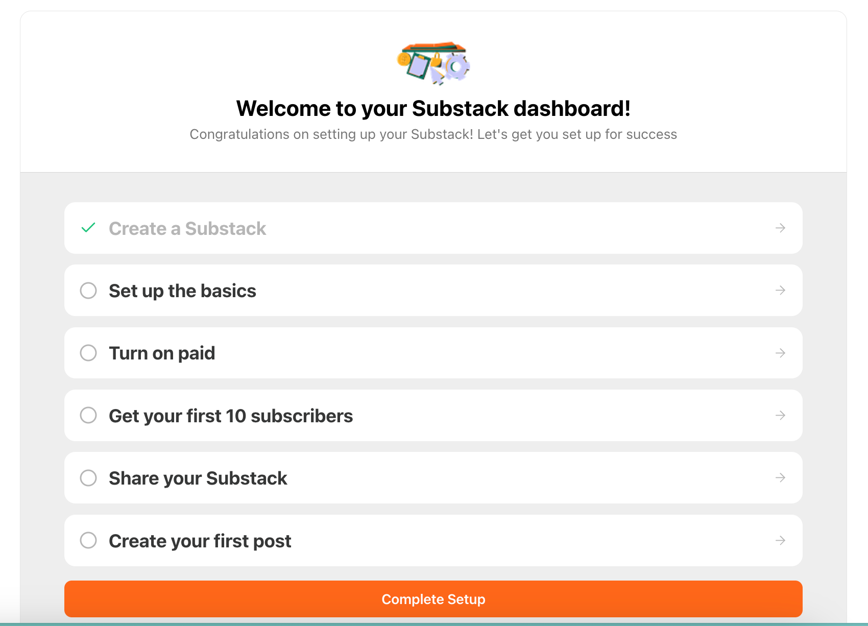 And if you need to take a pause before you set up, Substack will have this handy checklist waiting for you in your Dashboard.