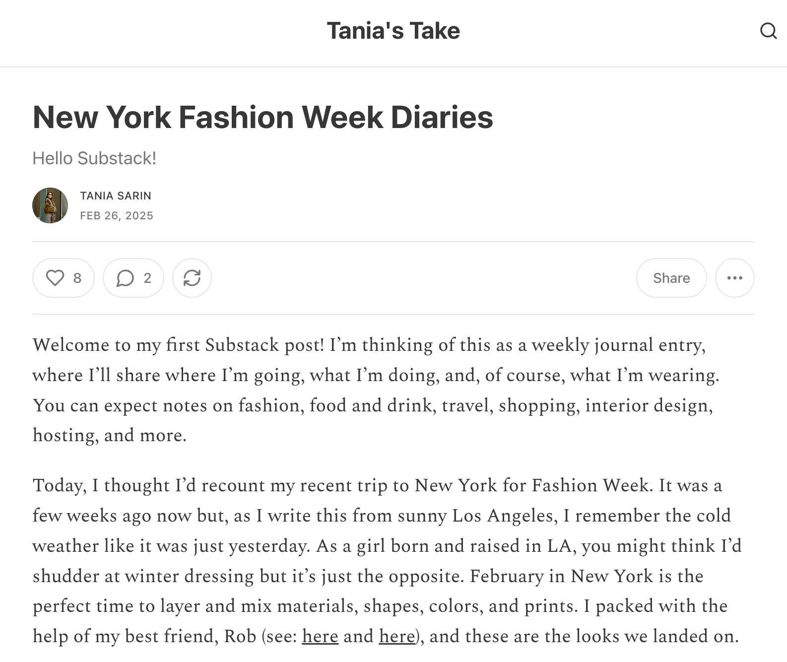 - It might take a while to grow an audience: Although content on Substack can go viral overnight, newsletter growth, in general, tends to be slow and steady. Many writers expect subscribers to flood in immediately, but that’s rarely true. "It took months before I saw real traction," said Fio Dossetto. "You have to play the long game. Keep showing up even when it feels like no one is reading." I second this as someone with a newsletter of her own.