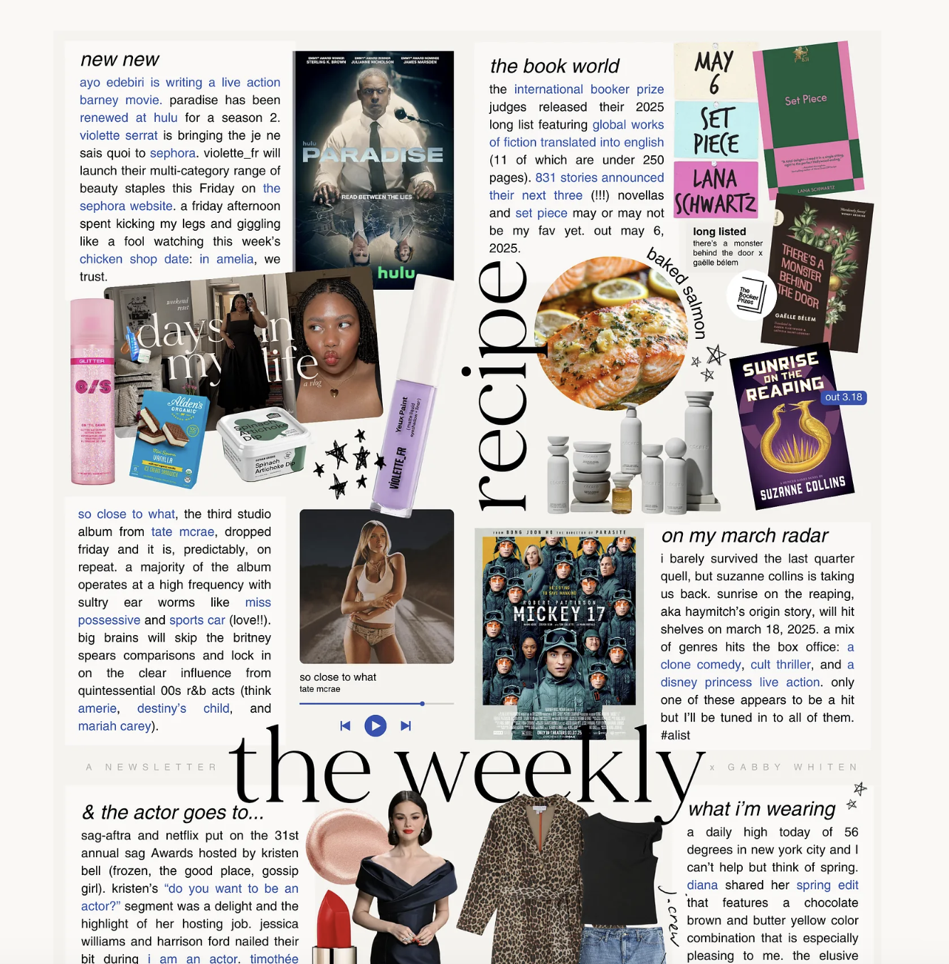 You don’t have to limit yourself to “traditional” formats — some of my favorite creators go against the grain to share incredibly formatted content, like Gabby Whiten, who writes Oh Eight, a lifestyle and fashion newsletter, and creates these elaborate collages for each issue.