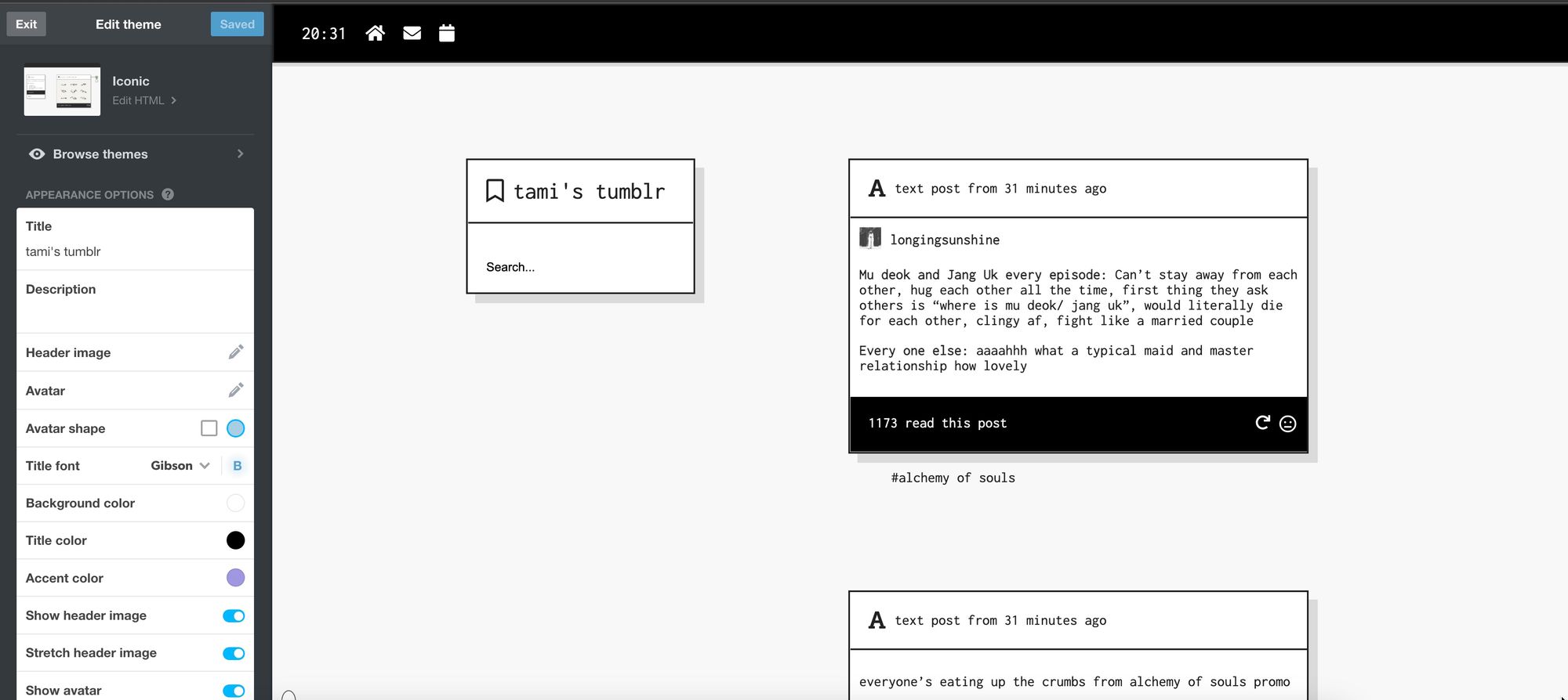 - Step 4: Customize your blog with one of the available themes. You have the option to keep your account simple, but if you want to reflect your personality, you can customize your blog and choose a unique “.tumblr.com” URL (mine is tamioladipo.tumblr.com). To customize your blog, click on the 👤 icon and navigate to 'Settings'. Then select 'Enable custom theme' and 'Edit theme'. Here, you can browse different themes to make your website look more unique – I use one called Iconic. You can also edit the HTML to your heart's content.