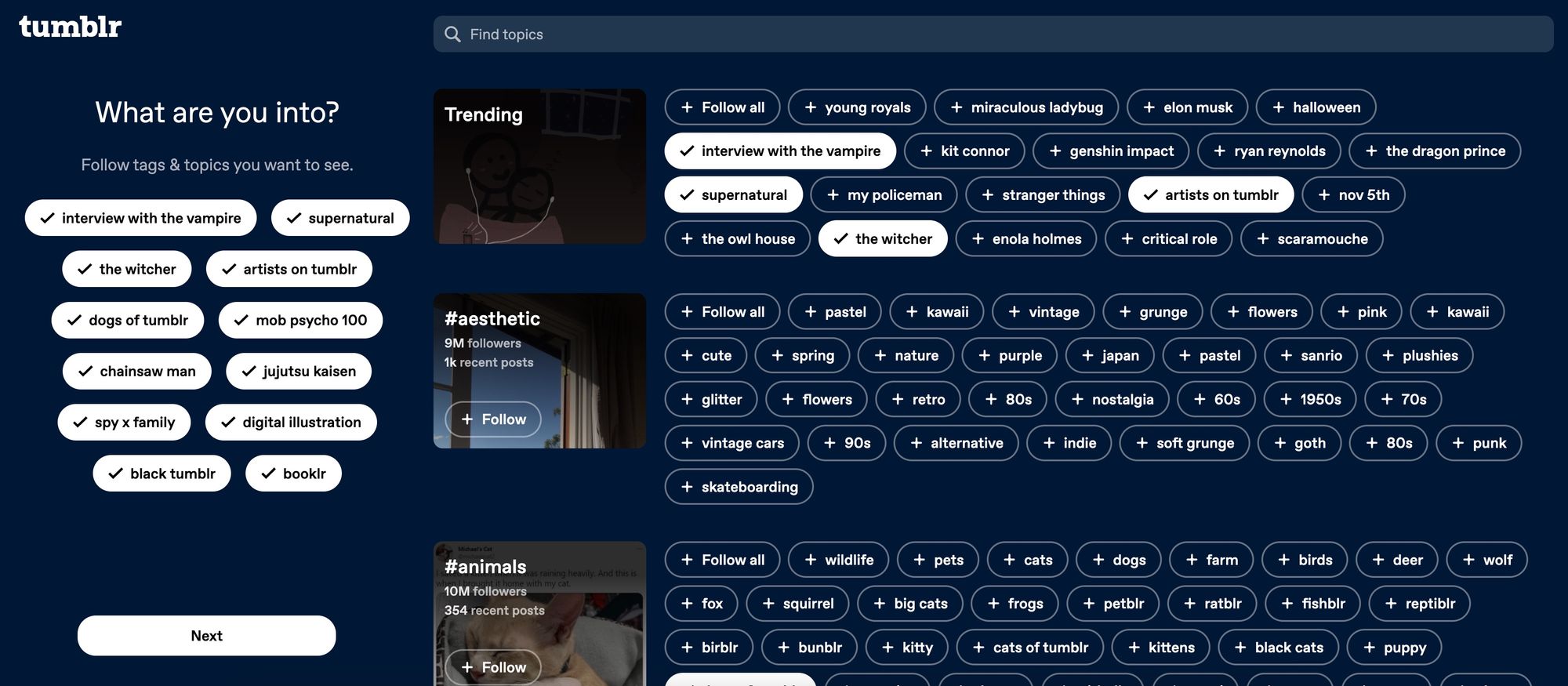 - Step 2: Select which tags and accounts you’re interested in following. Tagging is a great way to get more out of Tumblr because it helps you discover content and your content be discovered.