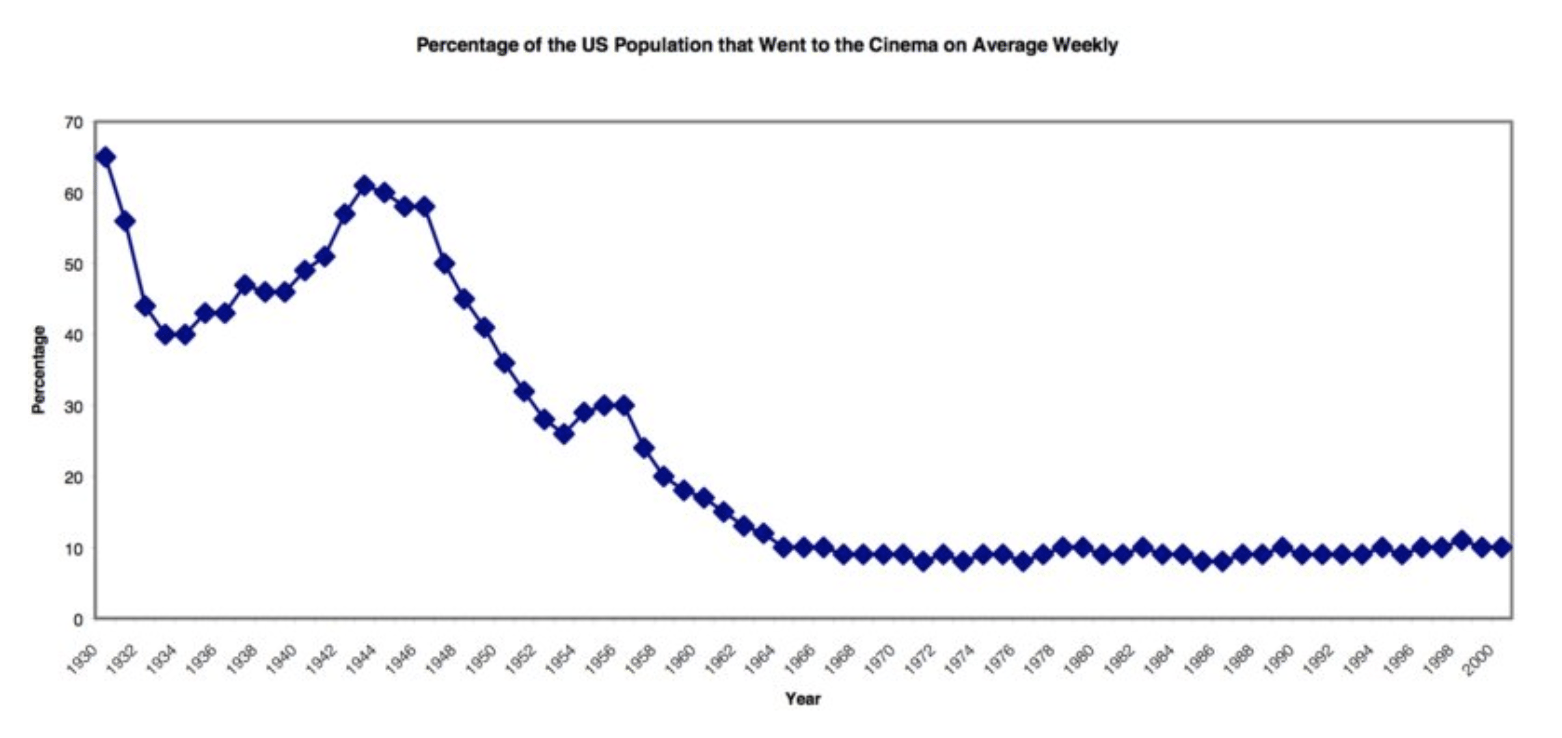 In the early 20th century, cinema was the clear leader, with 65 percent of the U.S. population attending the cinema each week in 1930.