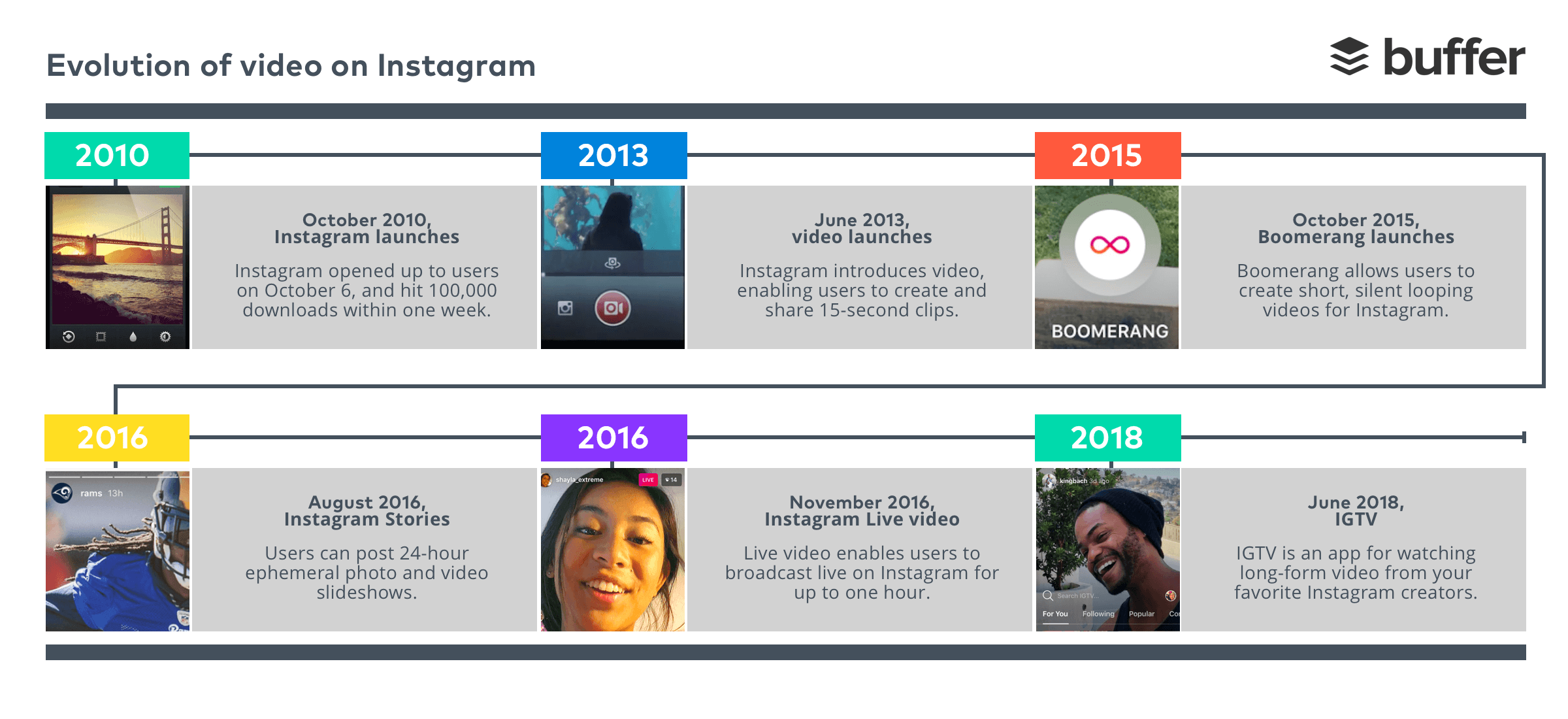 When Instagram first launched it was an app that enabled users to filter and share photos. In 2013, videos were added, allowing users to share 15-second clips to their Instagram feed. Next came 60-second videos, vertical video formats, full-screen live video experiences and Stories.