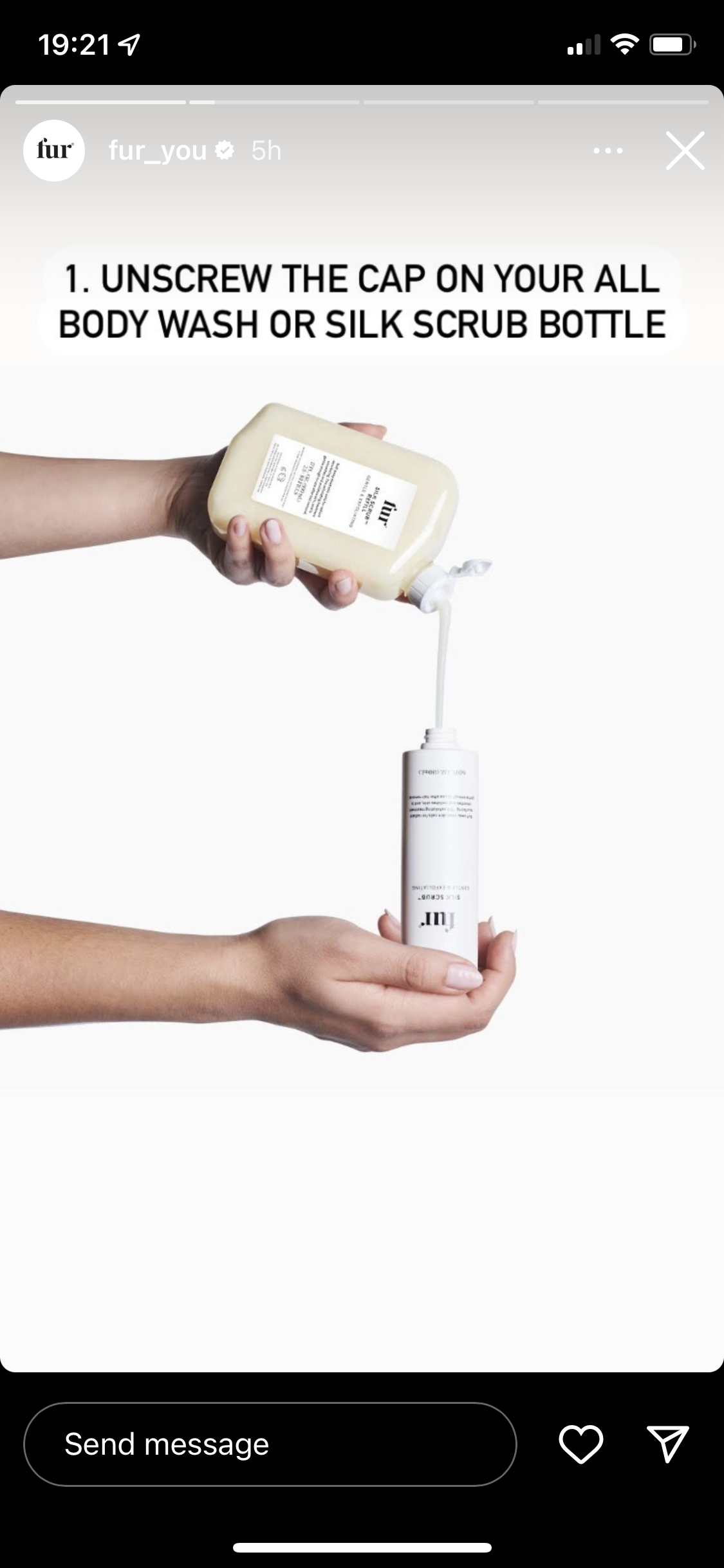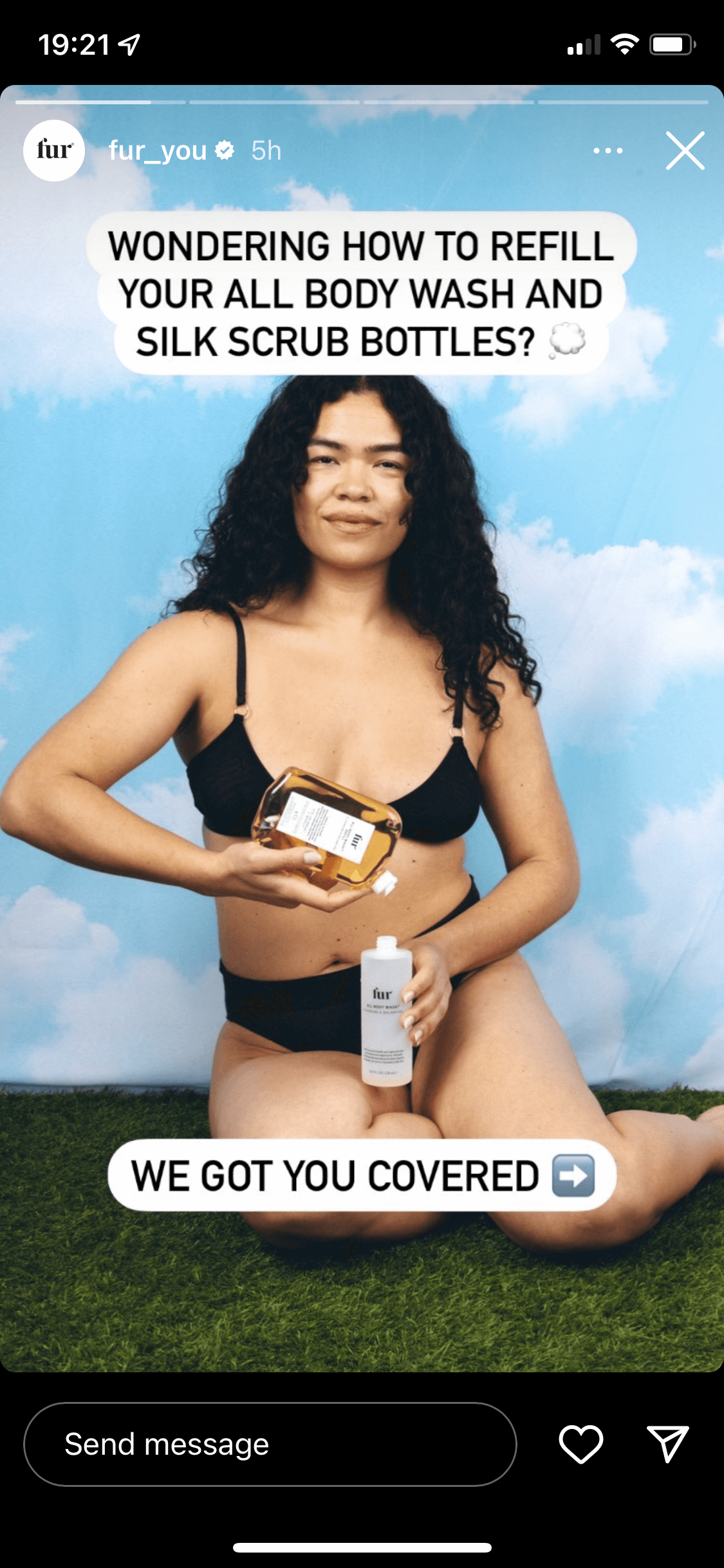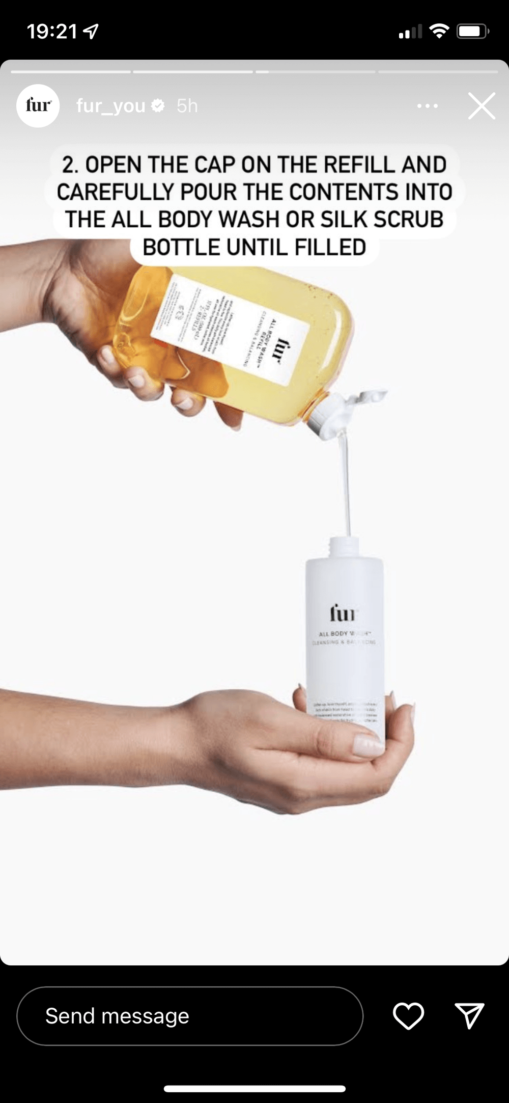 Fur, a body care brand (@fur_you on Instagram), communicates its views on sustainability in this story, encouraging and showing viewers how to reuse their empty containers.