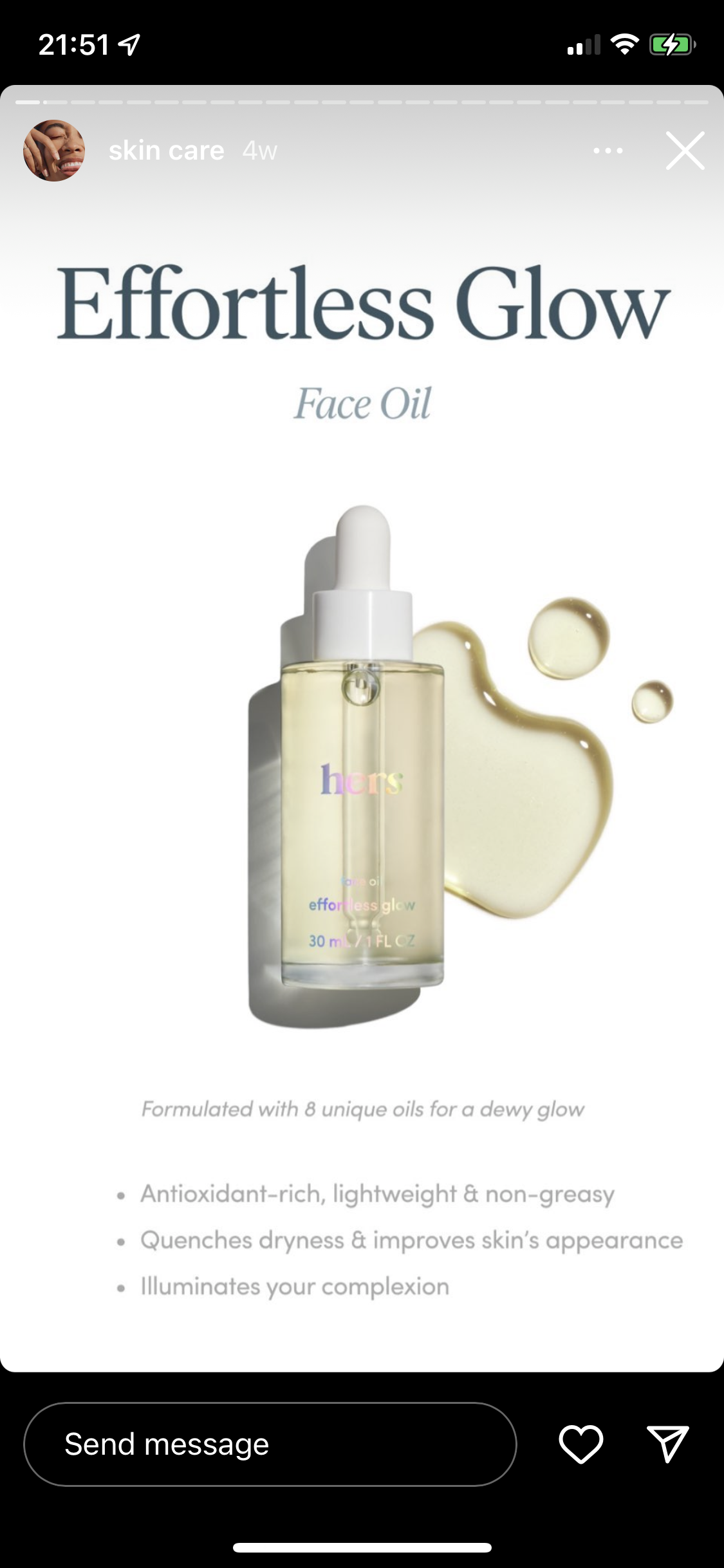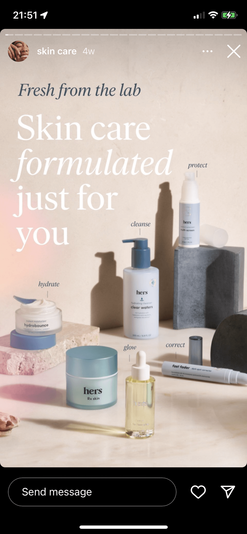 Hers (@hers on Instagram) uses their ‘skin care’ Instagram Story Highlight to explain what each of their products does for the skin.