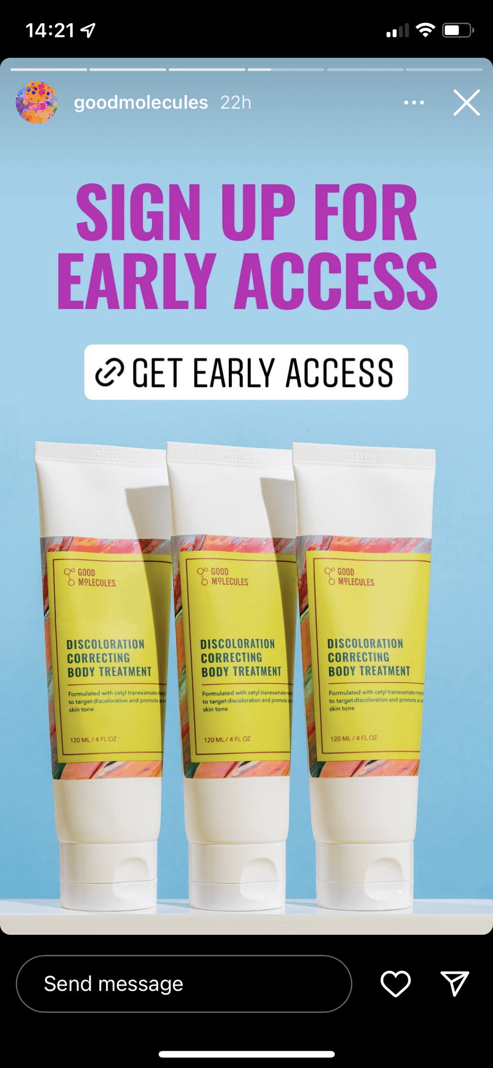 Good Molecules, a skincare brand (@goodmolecules on Instagram): Ahead of the launch of their new product, X, Good Molecules shared a series of stories that explained the product and encouraged users to sign up for early access.