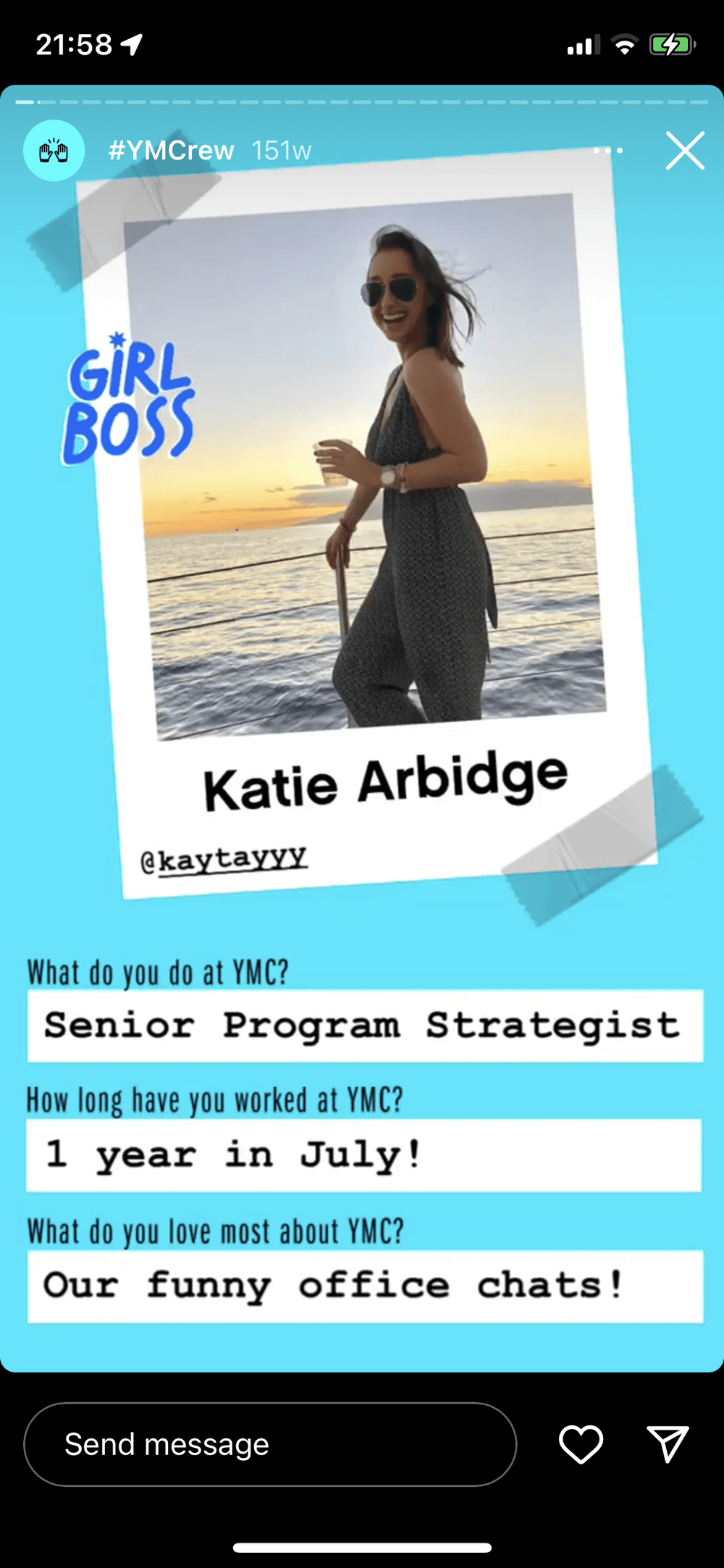 Youth Marketing Connection (YMC), a youth marketing agency (@youthmarketing on Instagram): 'YMC Team' stories throw a spotlight on different employees, showing who they are and what they like to do outside of work.