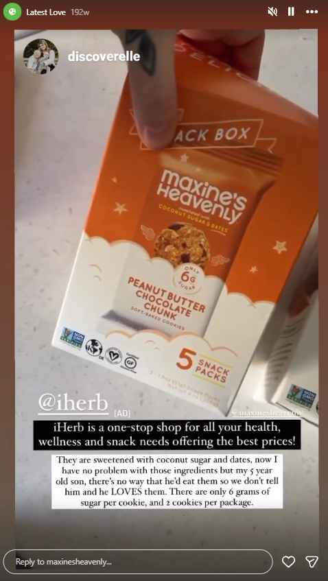 Cookie brand Maxine's Heavenly (@maxinesheavenly) has an Instagram Story highlight called 'Latest Loves' where they repost content from users who tag the account.