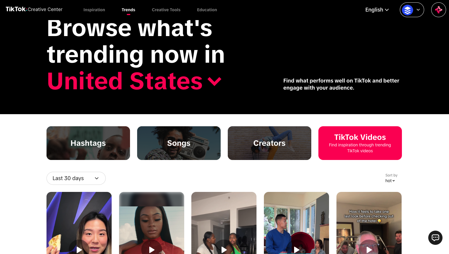 Here, you’ll find access to a trends chart for everything from trending TikTok sounds and songs to hashtags and the short-form videos themselves. The trending TikTok Videos tab can be particularly helpful in identifying viral moments early.