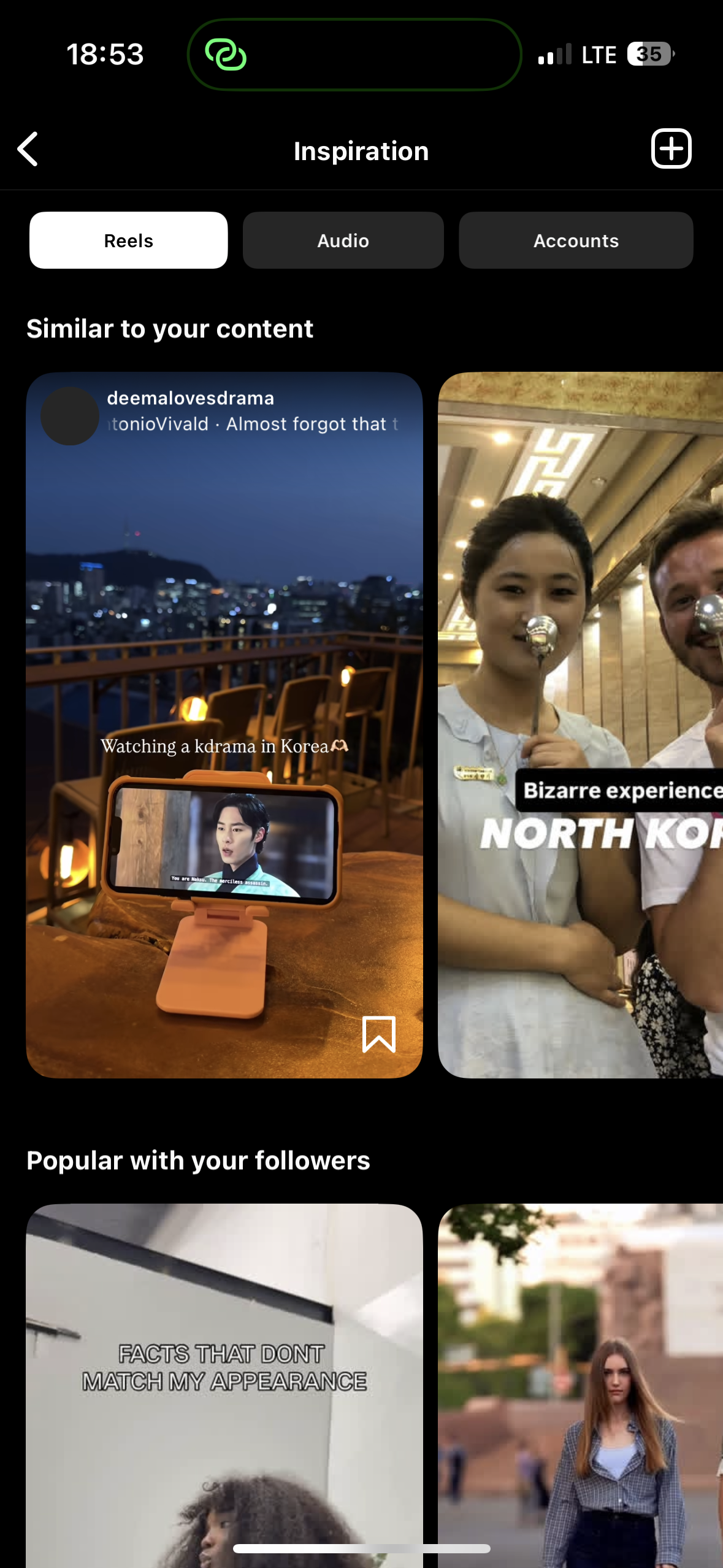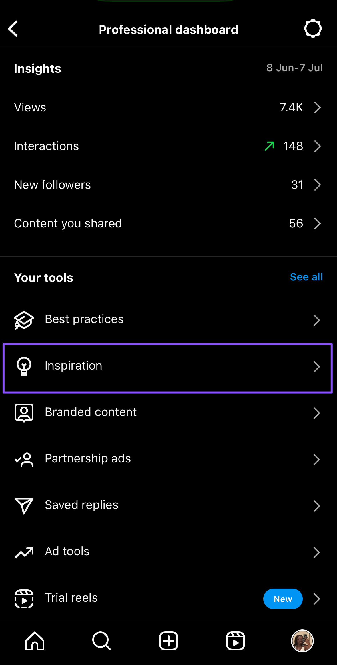 - Select Inspiration. Here, you’ll see reels that are similar to your content, popular with your followers, and suggested for you.