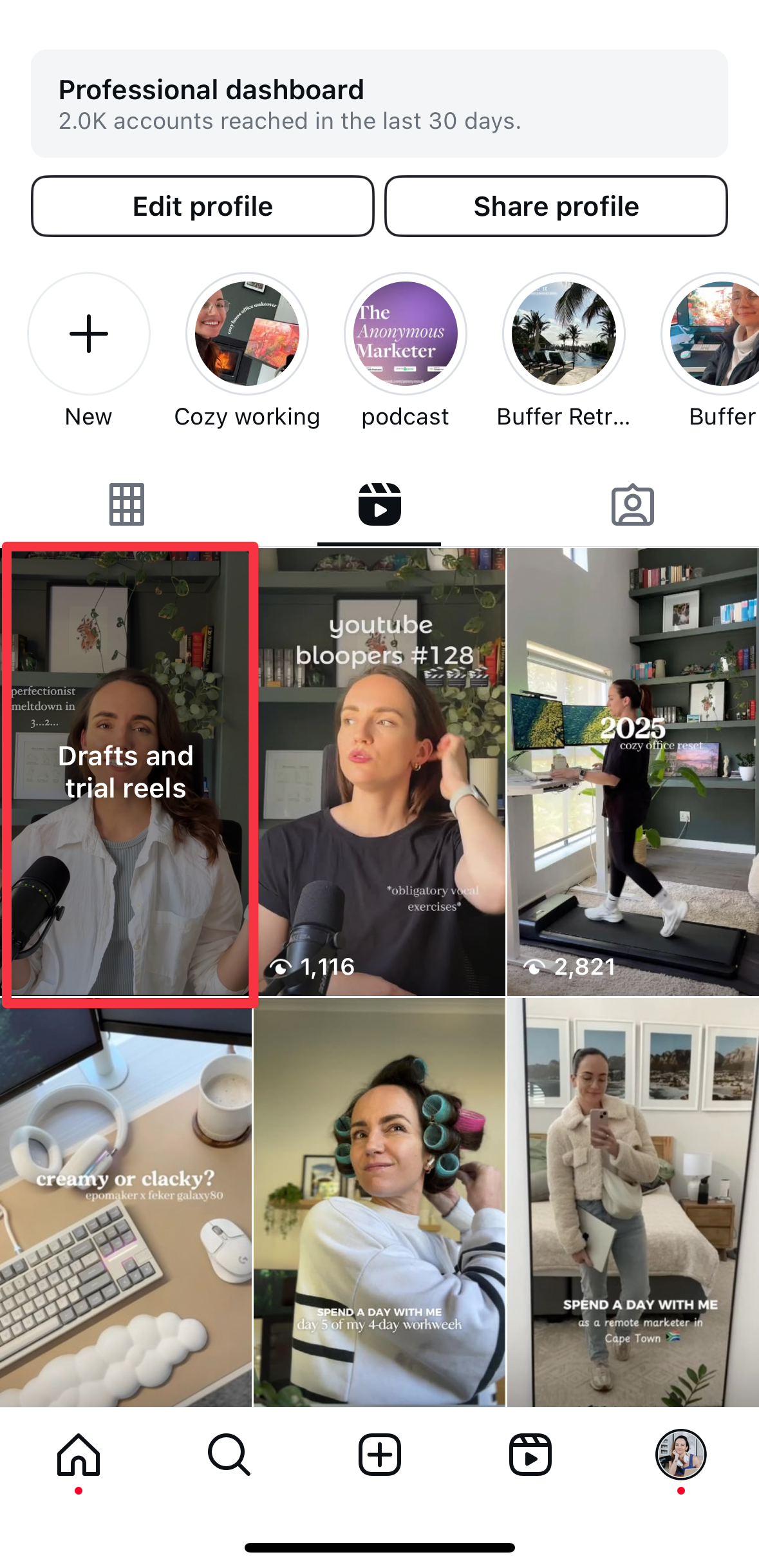 Since the reel won’t be visible on your profile, you’ll need to head over to your profile > reels tab, and then tap on the ‘Drafts and trial reels’ card.