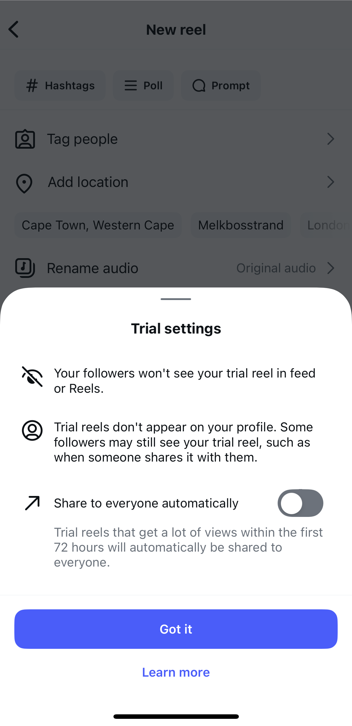 Another note on managing expectations — do give your trial reels at least 24 hours, preferably more, to percolate. Even in Instagram’s tool tips, they stress this: