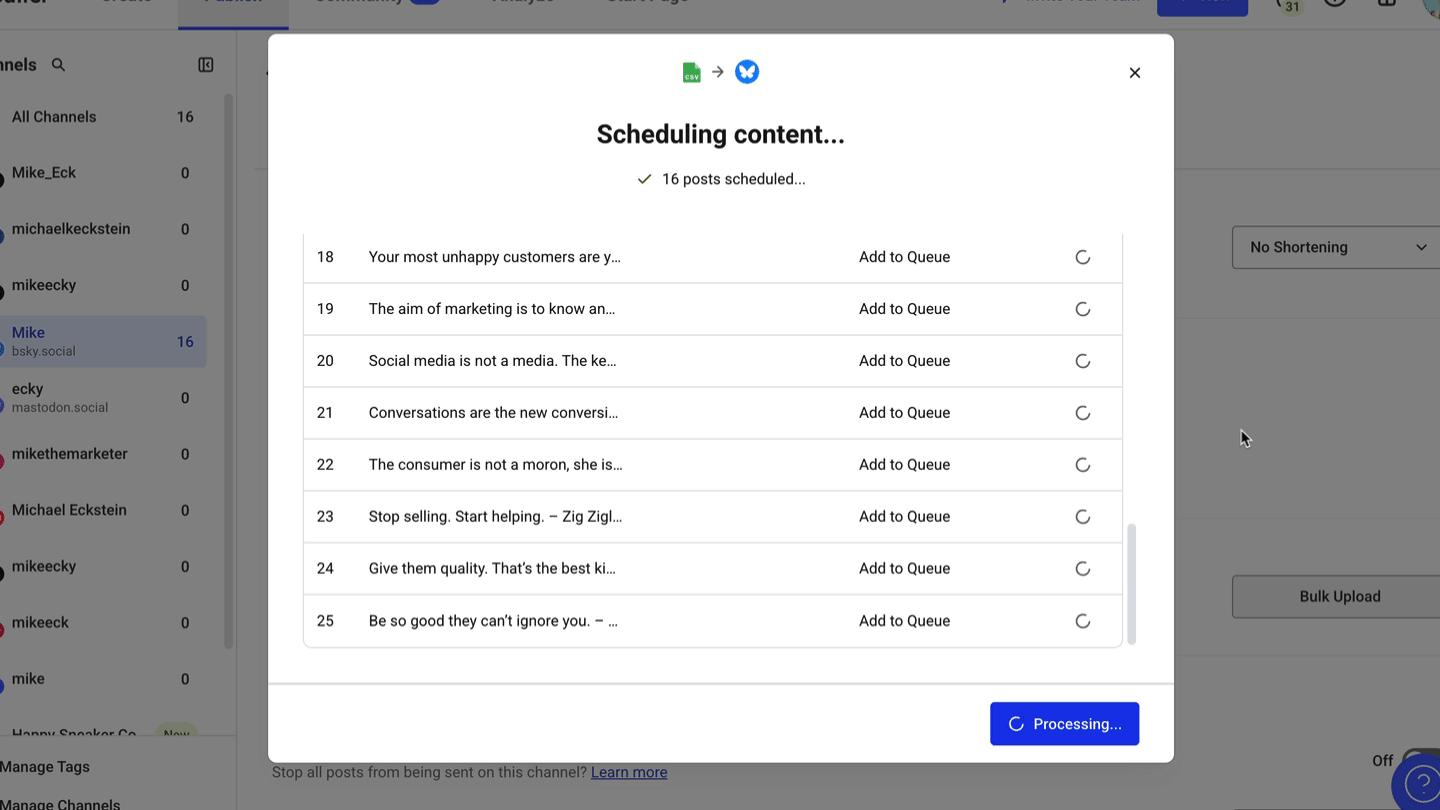 From there, it's simple. Go to the channel settings again to access Bulk Upload, choose your CSV file, and then schedule your posts.