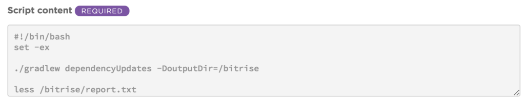 ./gradlew dependencyUpdates -DoutputDir=some_directoryNow after this command has been run, the content of the file will be written to a file at the given directory. And now that we have this step of our process implemented, we can go ahead and add it to a bitrise workflow step: