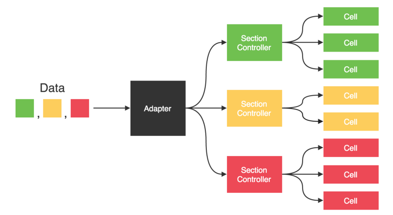 With IGListKit it’s a little trickier. Now, you say goodbye to UICollectionViewDatasource, and instead use an IGListAdapter with a IGListAdapterDataSource. The data source doesn’t return counts or cells, instead it provides an array of Section Controllers. Section Controllers are then used to configure & control cells within the given collection view section.