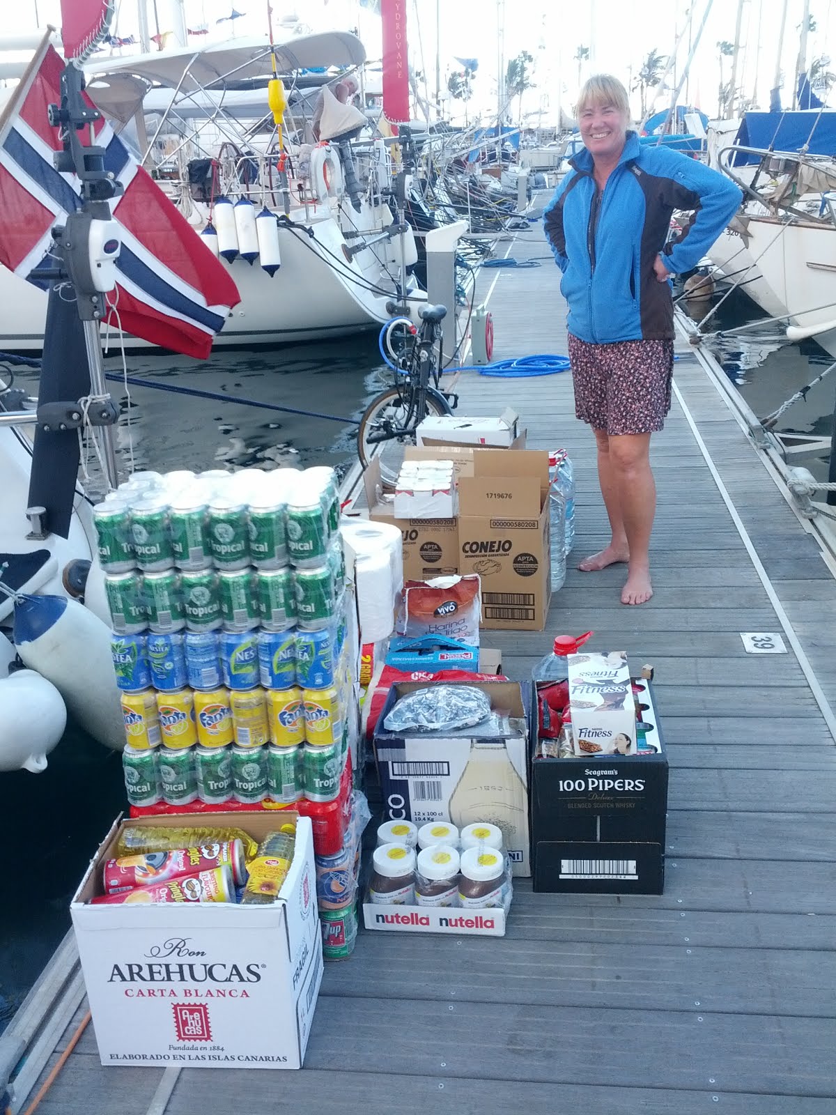 We left shore with great quantities of fruits, vegetables, and deep-frozen vacuum-packed meat (chicken/beef/pork/bacon). Usual snacks include peanuts, chocolate and fruits (limited supply!). Pictured here is about half of our food (and Trude looking delighted), including large amounts of Nutella.