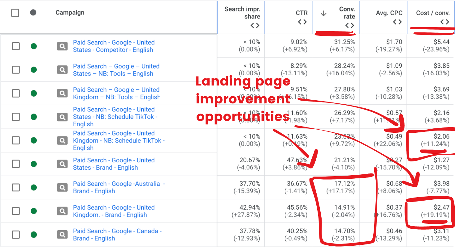 Ratios related to your conversions, like Conversion Rate and Cost Per Acquisition, will tell me there are optimizations that could be done on our landing page.