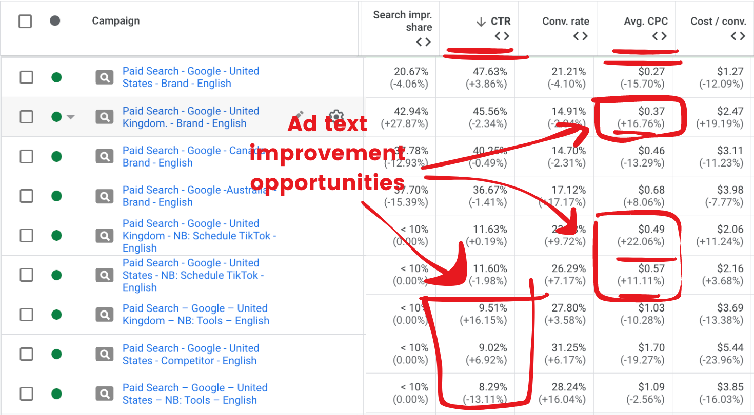 Generally, ratios related to clicks, like Click-Through Rate (CTR) and Cost Per Click (CPL), will tell you that there can be improvements made to your ad text.