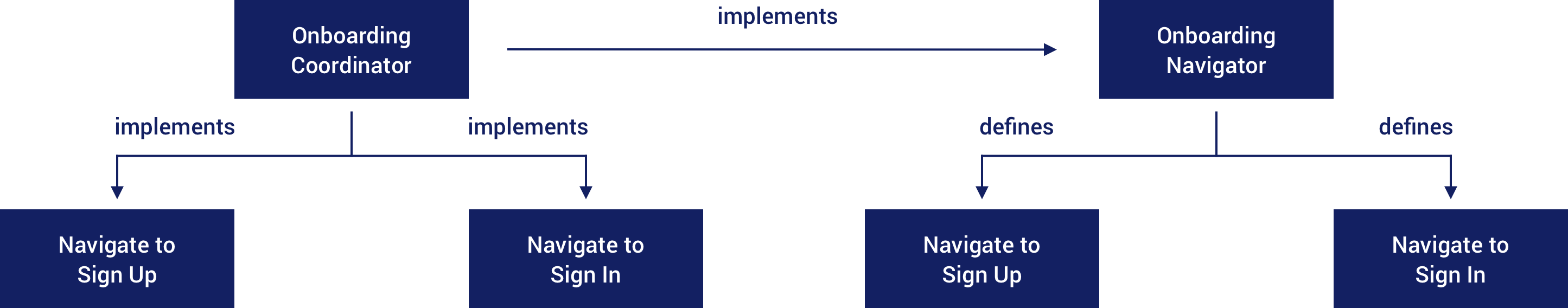With this in mind, the Onboarding library is going to need to provide an interface which states the navigational requirements that are going to need to be satisfied. This allows the onboarding module to define and enforce these requirements without having any knowledge around the actual details of these actions.